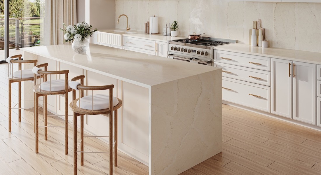 Na de introductie van Silestone Bronze Rivers in de Silestone Suma-collectie verwelkomt Cosentino een nieuwe kleur: Calacatta Tova. De verfijnde crèmekleurige ondertoon roept de serene sfeer van de kust op. De subtiele aders creëren een gevoel van beweging en harmonie, wat resulteert in een elegant en organisch geheel.