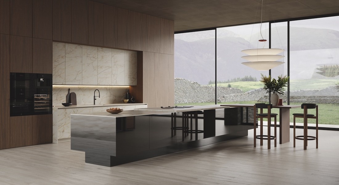 Ook de overgang naar de living krijgt concreet vorm met oplossingen zoals Rialto en Modula. De vrijstaande Rialto 360-graden vitrinekast functioneert als flexibele scheiding tussen keuken, eetkamer en woonkamer. Het Modula-wandsysteem is uitgebreid met nieuwe elementen, waaronder een wandlade die aansluit op de afwerkingen van de keukenlijnen.